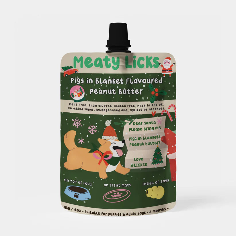 Verwöhne deinen Hund mit Meaty Licks - veganen, glutenfreien Erdnussbutterbeuteln aus hochwertigen Zutaten. Speziell zur Weihnachtszeit jetzt mit dem Geschmack von Schweinswürstchen im Schlafrock!
