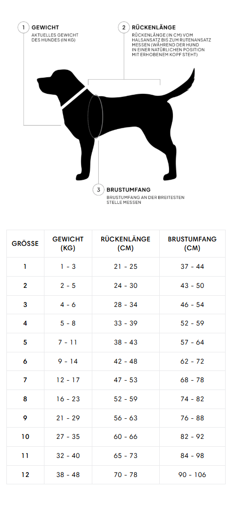 ** BACK LENGTH Measure from the bottom of the collar to the base of the tail (with the dog's head held high and the collar worn loosely).