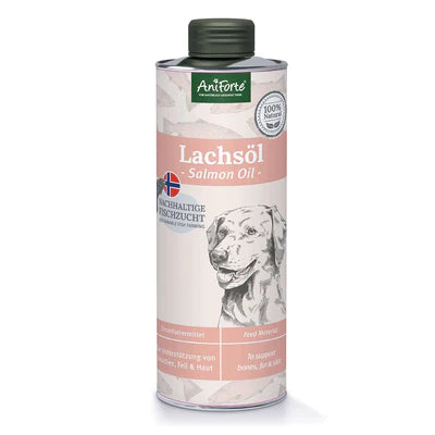 AniForte® salmon oil for dogs and cats is a purely natural addition to your pet's daily diet. You can easily add the oil to normal feeding or to BARF. The essential fatty acids contained in salmon oil help dogs and cats to optimally support their skin and coat health.