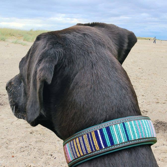 Das Mint Splash ist ein wunderschönes, braunes Lederhalsband mit handgefertigter Unterlegung aus türkisfarbenem Nappa und wurde mit farbige Perlen im eigenen Design der Herstellerin veredelt.