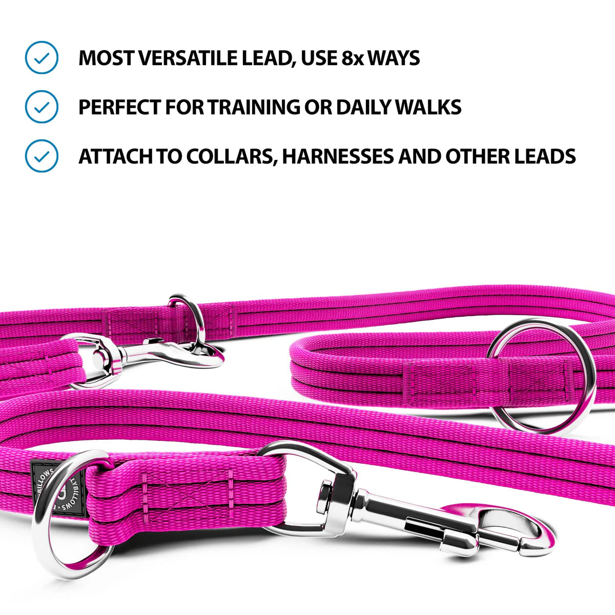 Die BullyBillows Trainingsleine mit Doppelenden ist eine multifunktionale, doppelseitige Leine, die auf 8 verschiedene Arten verwendet werden kann. Sowohl für den täglichen Gebrauch als auch für den professionellen Einsatz.