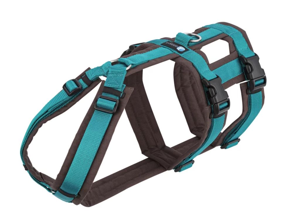 Das Geschirr ist so aufgebaut, dass es sich dem Körperbau des Hundes ergonomisch anpasst, dadurch entsteht eine optimale Zugverteilung, die den Rücken Ihres Hundes schont. Die umlaufenden Gurte im Brustbereich bilden dank des langen Unterbruststegs einen bewegungsfreundlichen Abstand zu den Vorderbeinen, so dass die Achseln geschont werden.