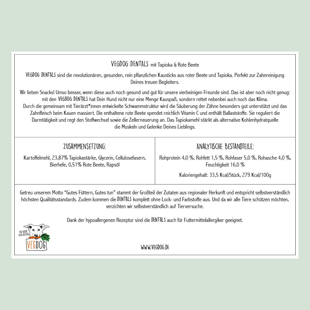 Die Schwammstruktur der VEGDOG DENTALS wirkt säubernd auf die Zähne, kann dabei helfen, Zahnbelag zu reduzieren und massiert das Zahnfleisch. Die Rote Bete in den Zutaten spendet Vitamin C, das Tapiokamehl liefert Power für Muskeln und Gelenke.