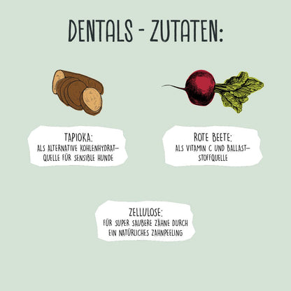 Die VEGDOG DENTALS stehen für extra langen Kauspaß und lassen deinen Hund auch künftig mit einem Strahlen hecheln, oder – wenn’s sein muss – auch mal beim Fletschen saubere Zähnchen zeigen! Unsere snackbare Hundezahnbürste ist durch die hypoallergene Rezeptur auch für Futtermittelallergiker geeignet, komplett ohne künstliche Lock-, Farb- und Konservierungsstoffe. Wie alle VEGDOG-Produkten wurden die DENTALS ohne Tierversuche entwickelt.
