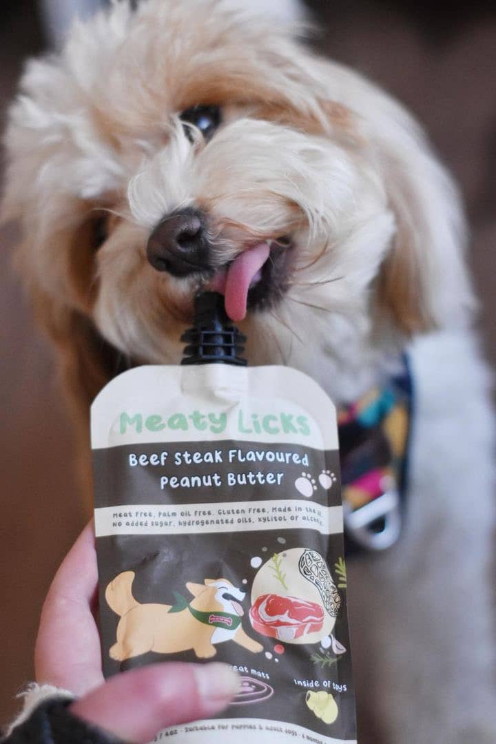 Verwöhne deinen Hund mit Meaty Licks - veganen, glutenfreien Erdnussbutterbeuteln aus hochwertigen Zutaten.