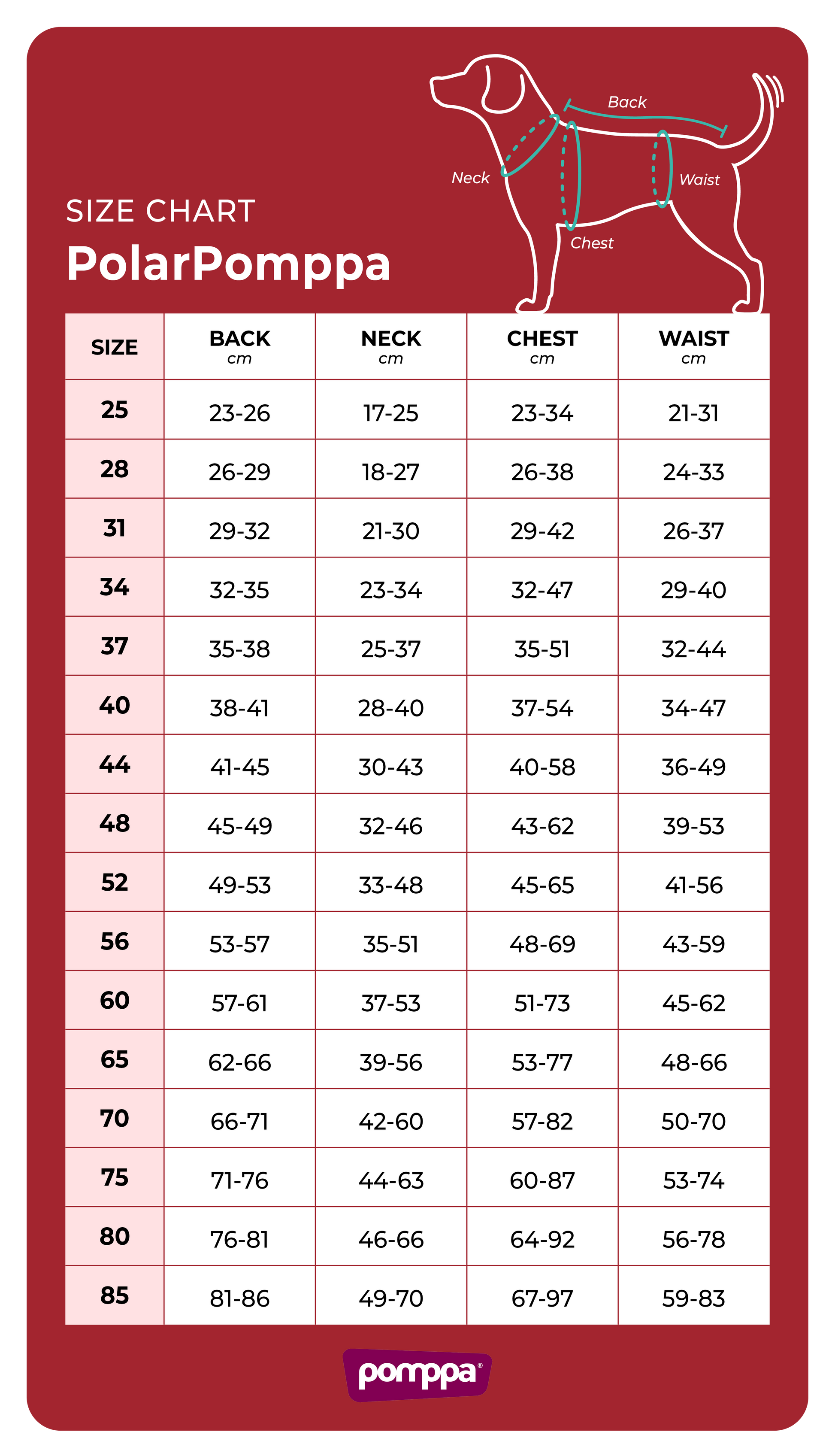 Die Pomppa-Grössen basieren auf der Rückenlänge des Hundes in Zentimetern. Massgeblich ist die Rückenlänge. Da der PolarPomppa körpernah geschnitten ist, empfehlen wir bei Zwischengrössen die grössere zu wählen.