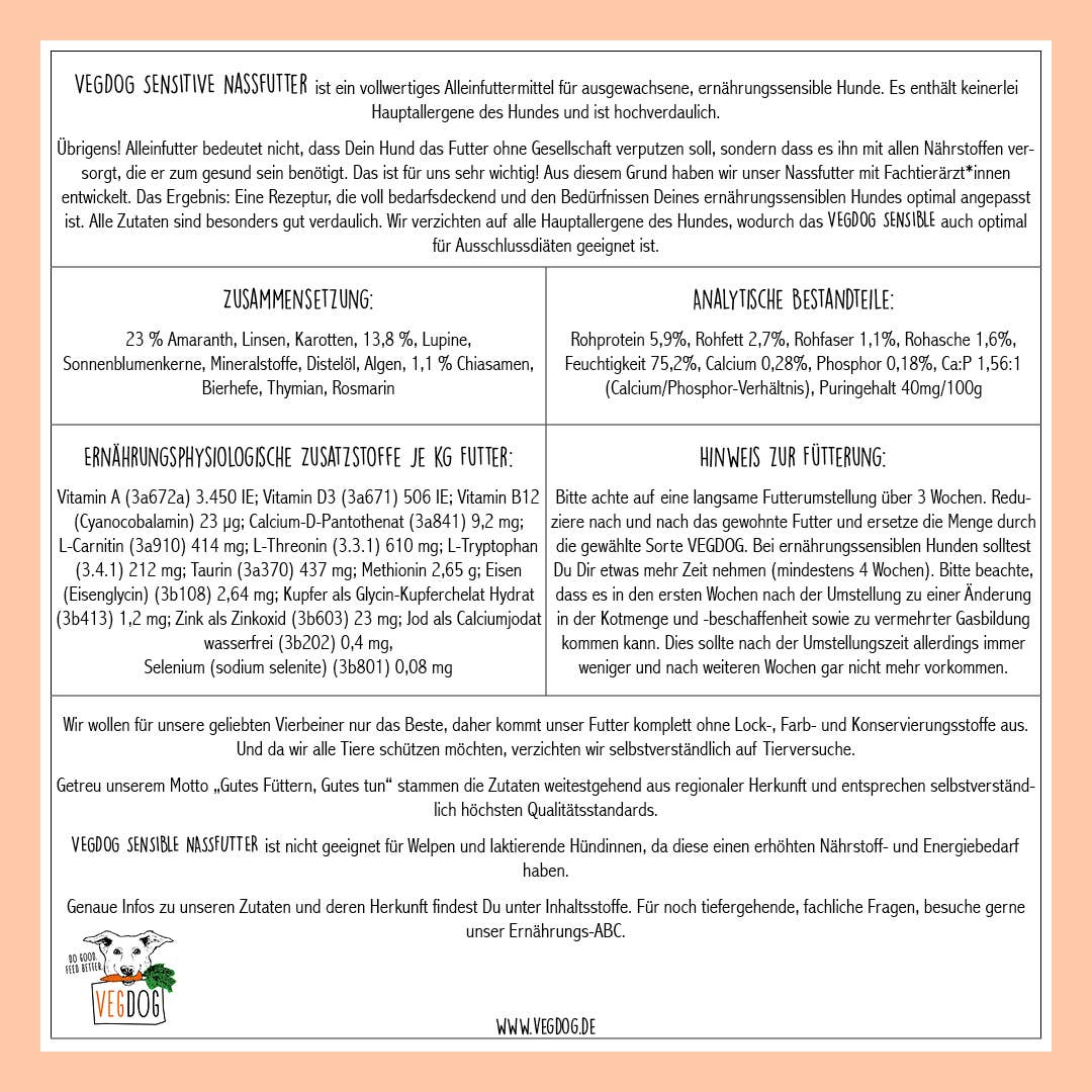 Aufgepasst: VEGDOG SENSITIVE ist nicht geeignet für Welpen und laktierende Hündinnen, da diese einen erhöhten Nährstoff- und Energiebedarf aufweisen.