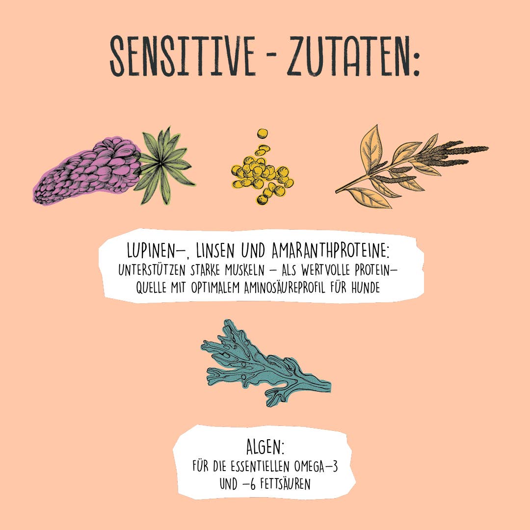 Das Nassfutter ist besonders für Allergiker und futterempfindliche Hunde ab zwölf Monaten geeignet. Bei der Herstellung wird bewusst auf die Zugabe sämtlicher Hauptallergene von Hunden verzichtet, und damit der Eiweissbedarf ausreichend gedeckt ist, werden bei der Herstellung Lupinen-, Linsen- und Amaranthproteine verwendet. Diese wertvollen Proteinquellen verfügen über ein optimales Aminosäureprofil für Hunde und stärken damit die Muskeln Deines Vierbeiners.